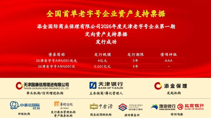 2月4日,由津智资本所属天津国康信用增进有限公司(以下简称“国康增信”)牵头发起,携手渤化集团、中环产业集团、纺织集团、旅游集团、北方国际集团共同打造的全国首单老字号企业资产支持票据,在中国银行间债券市场成功落地。该项目由国康增信下属全资子公司添金国际商业保理有限公司作为发起机构,天津银行作为主承销商,总规模4.001亿元,期限3年。